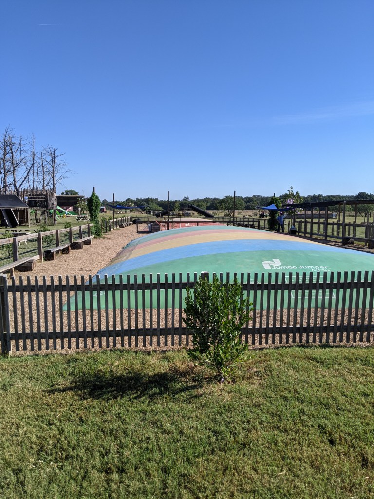 After this we met up with a few friends and we all rode the Texas Hayride Trail which is a nice ten minute ride around to see some of their farm animals. This is one of the reasons I like the one entry fee price instead of paying per ride. If your kids really like one attraction you can ride it over and over again without paying for a ticket each time. We definitely got our money’s worth on the Jumping Pillow because our eight year old and his friend bounced for at least 30 minutes throughout the day. After we did the rides, we let the kids play on the many different slides and the play structure. The slides are simple, but fun and let me tell you: they go fast. I definitely felt it when I went down with my two year old on my lap and slid onto the ground. The play structure was also really fun; it was built like a tree house and had a rock wall, four slides and a bouncy bridge. We spent quite a bit of time sitting in the shade here enjoying a frozen lemonade and just letting the kids run around. Something else that I really appreciated about this Fall Festival was there were multiple food and beverage options spread out throughout the farm. They had a station for chicken fingers and fries, one for pizza, another for ice cream and many smaller stations for specialty drinks like frozen lemonade or sangria. New this year they also had The Apfelwein & Biergarten for the 21 and up crowd. Since we were there with our families we did not visit this time, but it looked like a fun spot and it overlooked the river which is neat.