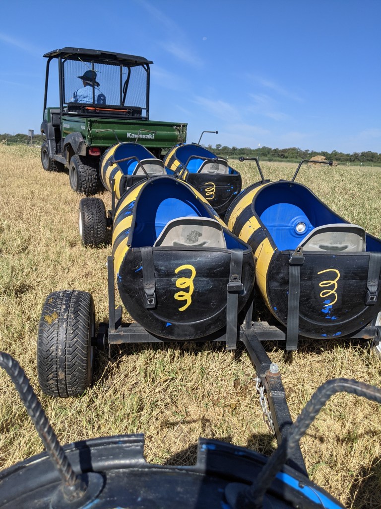 Being that it was the first day, I did not think it would be super busy, but I noticed there were already many cars pulling into the parking lot when we arrived just before our 10 a.m. entrance time. The event never felt overcrowded, but I can imagine as we get closer to the end of October the crowds will pick up. One of the first things I noticed was that the activities were nice and spread out so it never felt like there were a ton of people around us. Being that we are still in a COVID world I appreciate events that don’t make you feel like people are on top of you. Right when we walked in my eight year old son noticed the two Texas Jumbo Jumping Pillows and ran right for them. My two year old seemed very interested as well, but when we walked up they informed us that kids must be 3 and older to jump on the bounce pad for safety reasons. He was a bit upset, but the nice lady working at the farm had a backup plan ready for us. She suggested we try out the bee train and even radioed over there to make sure they were ready for us so off we went. Since our kids are 6 years apart this happens often where my husband and I each take one kid and we let them do a few activities on their own and then we meet up later for some joint family events. The Bee Train Ride was a big hit for our two year old. This was his first solo ride experience and he was smiling the entire time and saying “choo choo”. The “bees” are in rows of two so I was able to sit in the bee right next to him just in case mid ride he decided he was no longer a happy camper. The train goes through a field and lasts about seven minutes so it is a perfect ride for a little one. If you have a baby or a child who cannot (or maybe does not want to) sit in their own “bee” then they can sit on your lap to enjoy the ride.