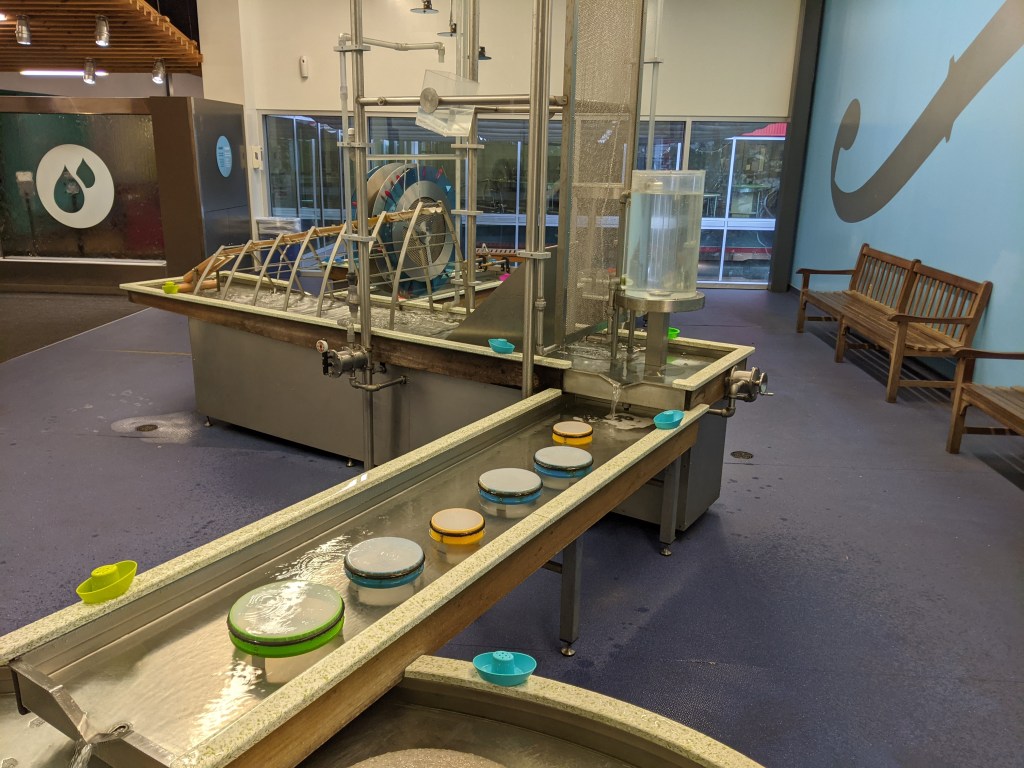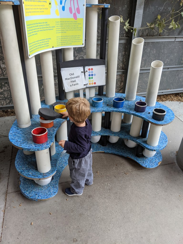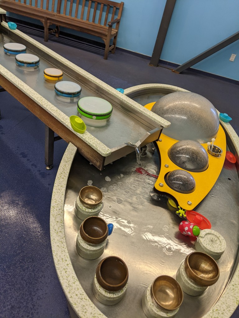 After checking in we went right upstairs. I was letting my son guide the way so we went wherever he wanted and since it was our first time he was excited about everything. We started at the Currents exhibit which is the water play area. They have water wheels, boats to play with, and drums to tap on. It is a mixture of water play as well as music because they have chimes and other items the kids can play on to hear different sounds. Also, something that is really neat is water dripping from pipes up high play sounds on the drums. A couple things to mention about this area is that it is very likely your children will get wet. They do offer smocks and water shoes to wear, but even with all that it seems like they can still figure out a way to drench their clothes. With this in mind I would recommend visiting this attraction last right before you are done for the day or bringing a spare change of clothes.