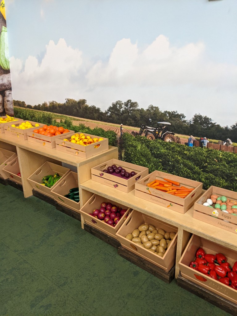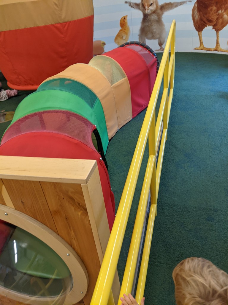 The Fresh! Farmers Market exhibit was right next to Bloom and it was definitely a kid favorite. They have an entire wall full of crates with wooden fruits and vegetables as well as a kitchen where the kids can pretend to cook. We spent at least 30 minutes picking up different vegetables and pretending like we were making soup. My two year old loves to hold eggs at home (which always makes me nervous because we all know how easily they break!), but luckily the museum had two full crates of wooden eggs which he loved. They also had a pretend chicken coop the children could climb in and learn about which hen lays the different eggs. This space was my favorite because I enjoyed watching all of the kids running around and cooking their pretend meals. We spent the majority of our time at Thinkery in these two sections because he would just go back and forth from the Bloom Exhibit to the Farmers Market.