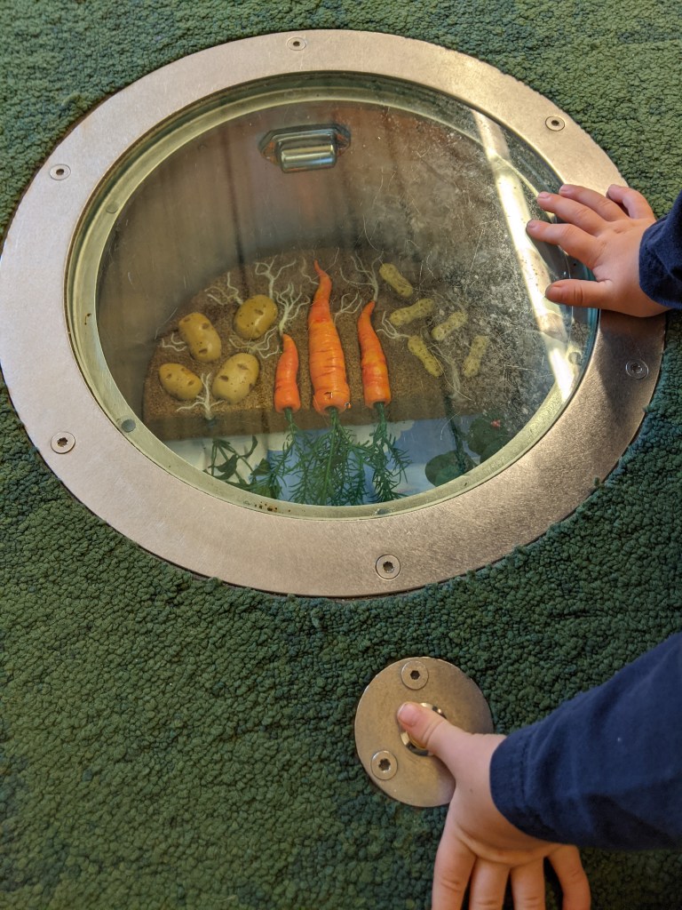Next we were off to the outdoor area called Our Backyard. This area has different activities for all ages. They have a tall climbing structure with ropes and tunnels as well as smaller climbing structures lower to the ground like little tree stumps. They also have a fun water play area with toys to use while exploring. In my opinion Thinkery is ideal for children 1 to 6 years old, however this outdoor area is great for older kids as well. After being outside we decided to go back inside where it was warm and then we found my two year olds favorite spaces which were the Bloom and Fresh! Farmers Market exhibits. The Bloom space is only for children 0 to 3 years old and you must take your shoes off when entering this area. It is a great space for crawlers and toddlers with lots of things to explore that are low to the ground. My two year olds favorite were these little circular windows on the floor that had different vegetables or animals to see and you can press a button to light them up. They were very simple, but fun to explore because there were many things to look at inside each one. He also loved the tunnel and going up and down the ramp.