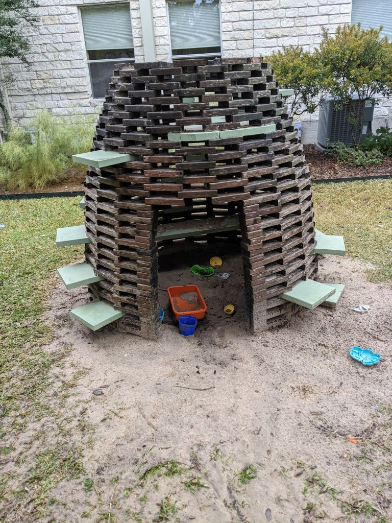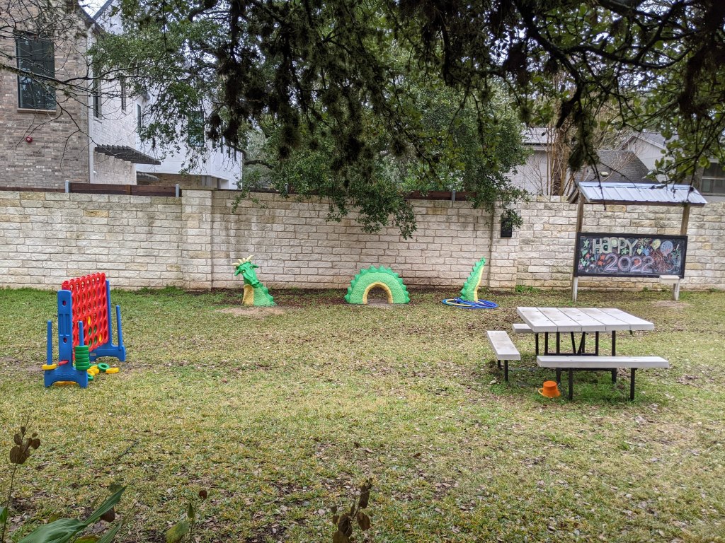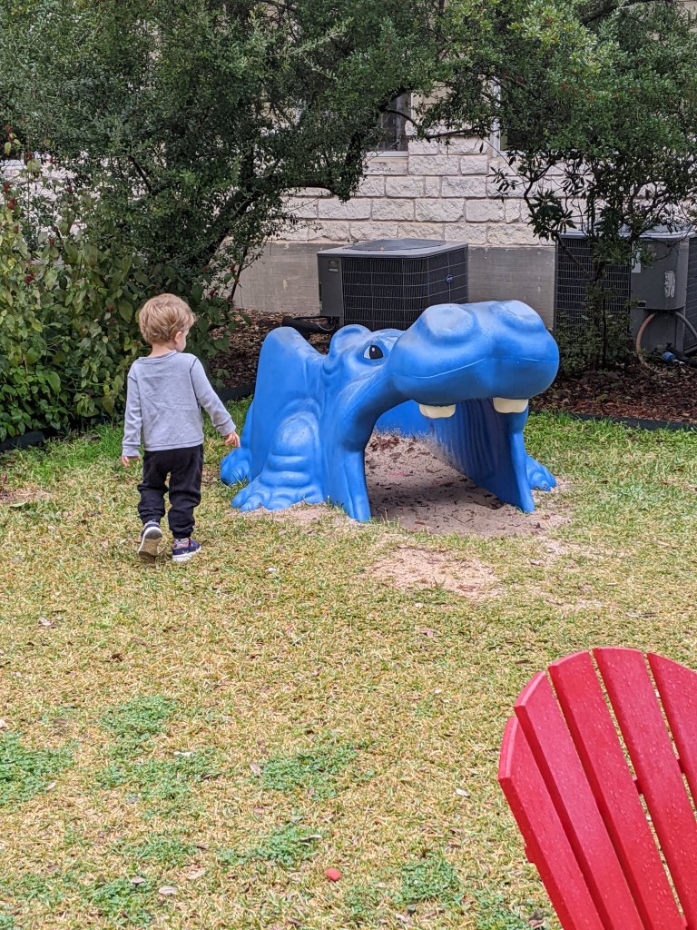 After we checked out the indoor children’s room we decided to go explore the outdoor space. It had rained the day before so everything was still very wet (not ideal for playing), but they definitely have some great activities for kids that we will come back and enjoy on a drier day. There is a sandbox with plenty of toys as well as a little tunnel shaped like a hippopotamus that my two year old liked going through. They also have a little hut for kids to play in and some fun yard games. It is a spacious outdoor area with plenty for the kids to do as well as nice spots for adults to sit and read or relax.